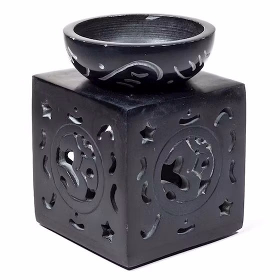 Aromalampa i polerad och lakerad täljsten med Ohm utskuret. Oljeskålen är lös vilket medför att den enkelt kan rengöras