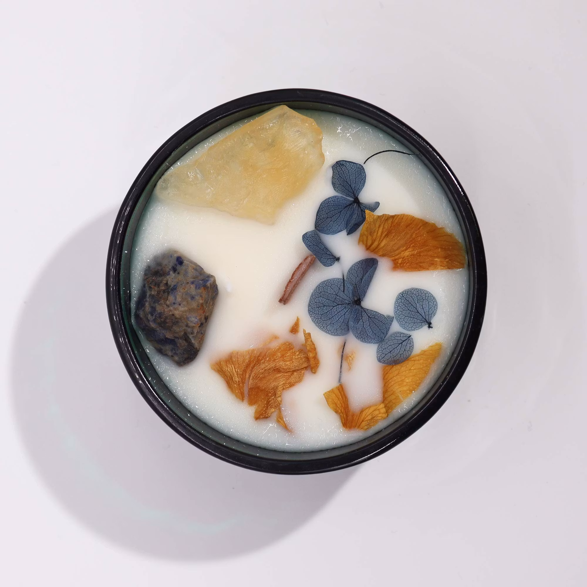 Underbart doftljus i glasburk gjort på sojavax med trävekar & citrin/sodalit .