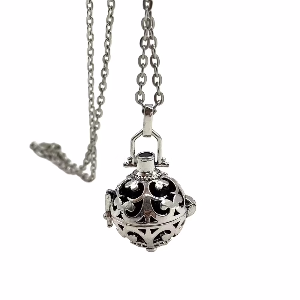 Öppningsbart halsband med lavasten. Droppa 2-3 droppar eterisk olja på stenen. Doften sprider sig via halsbandets genombrutna väggar.
