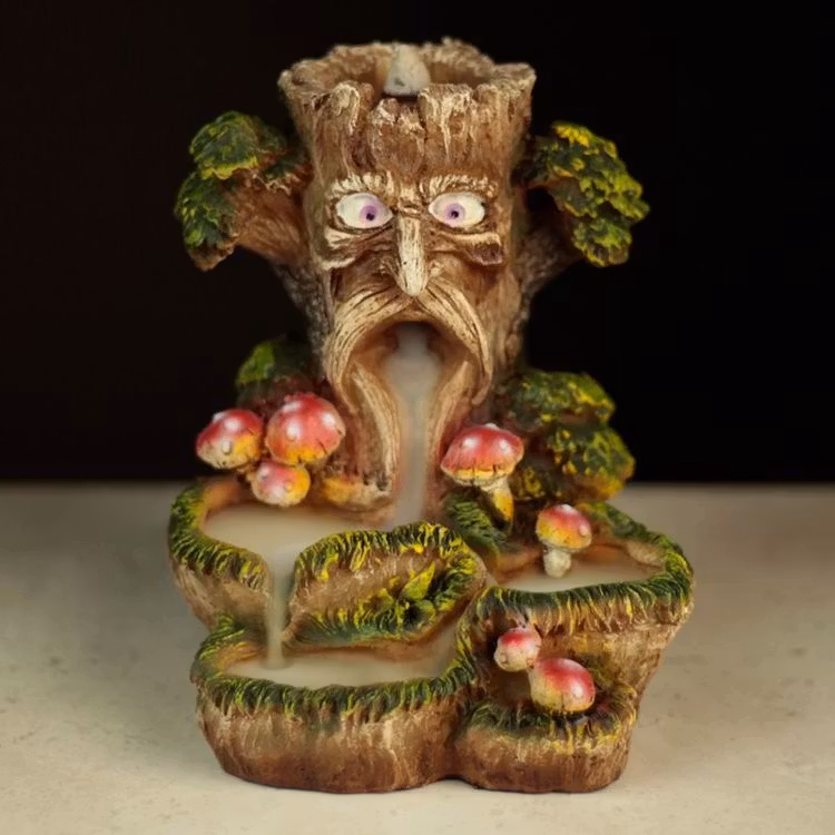 Backflow rökelsebrännare är designad att att skapa ett dramatiskt flöde av rök, som rinner nedför trädet och samlas i skålen nedanför (på sätt som framgår av bilden).