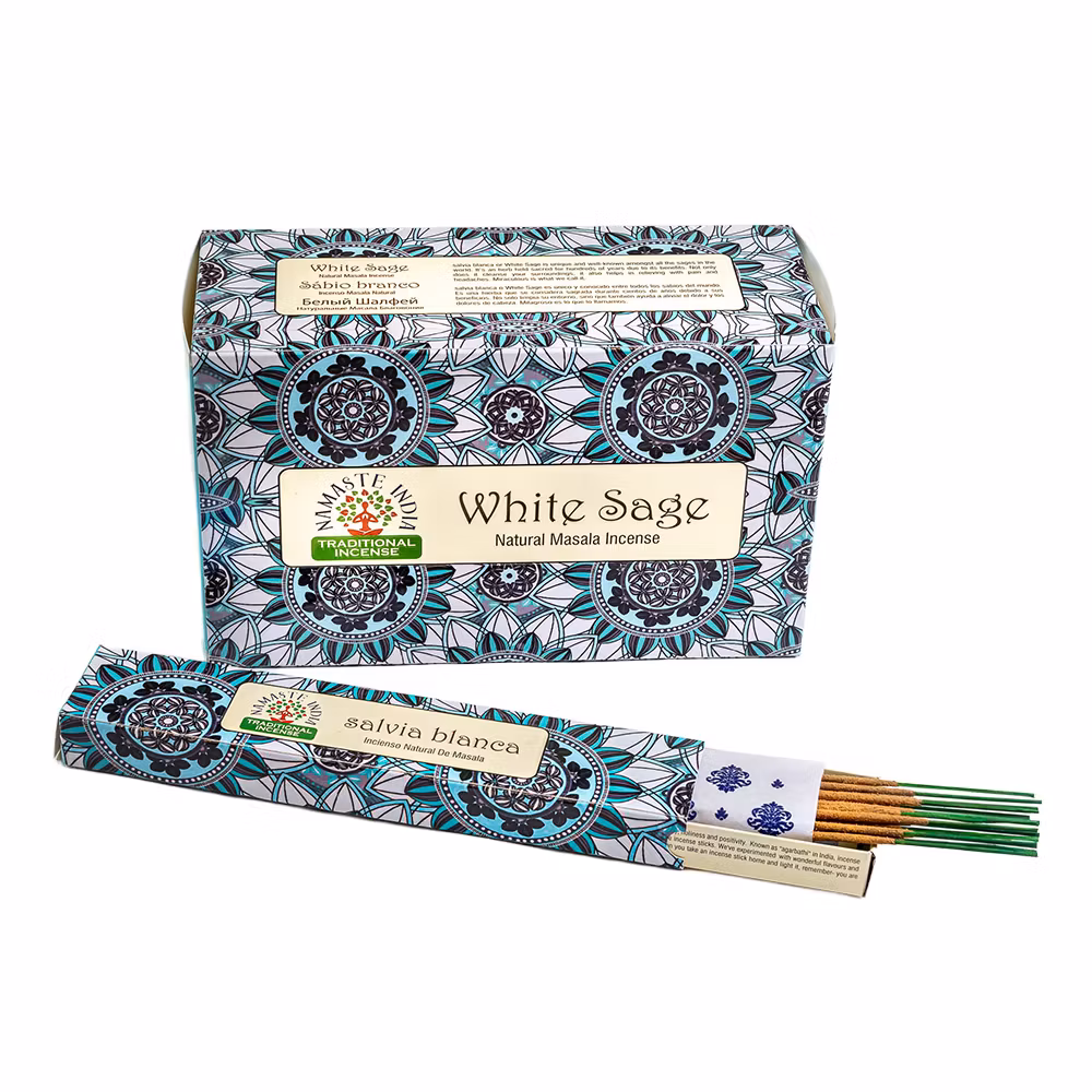 Rökelsestickorna är handrullade av helt naturliga örter, andra växtdelar och oljor. Vit salvia används ofta för att rensa negativa energier och främja andlig förnyelse.