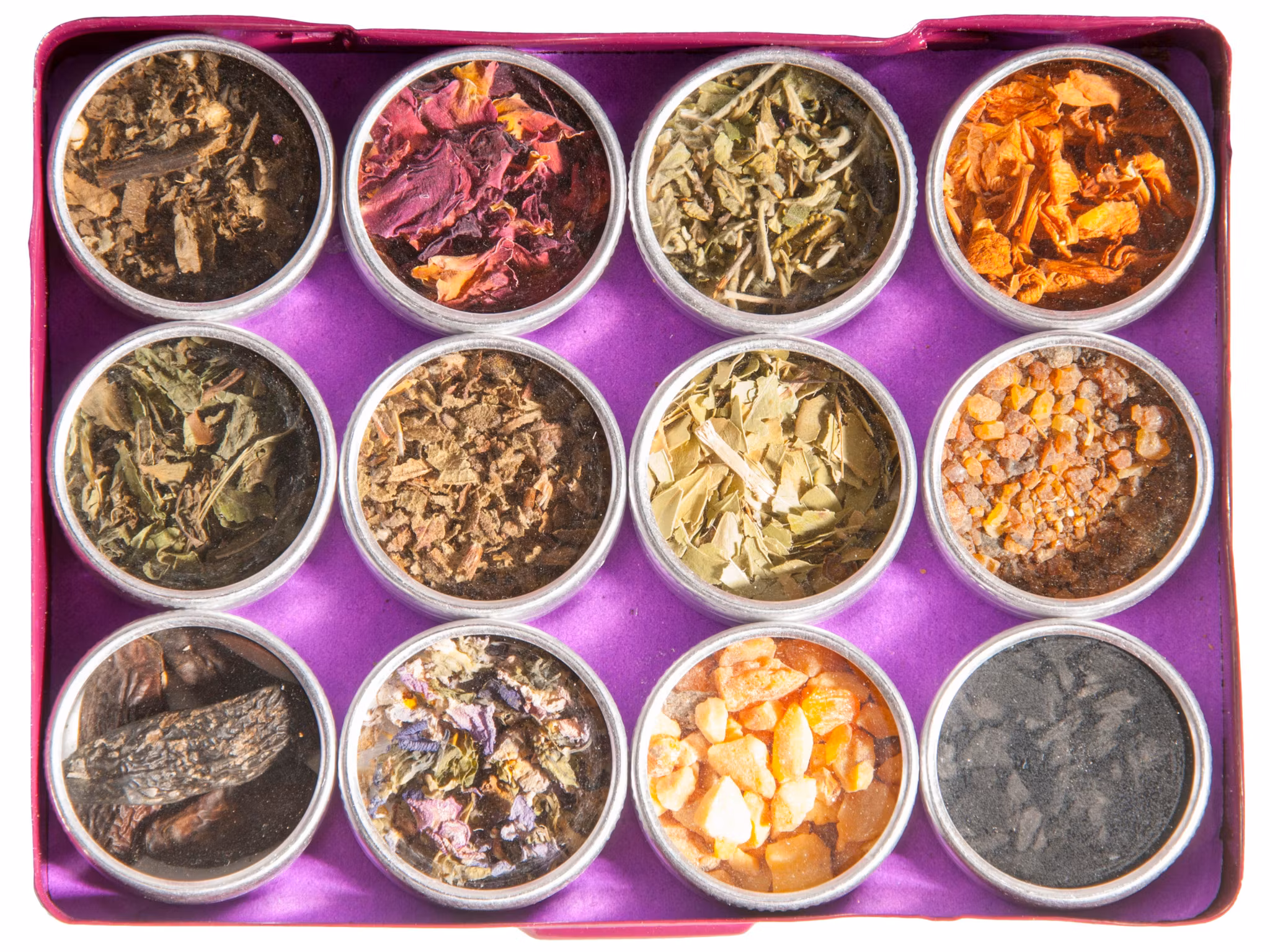 Plåtask med ett sortiment av de mest omtyckta rökelserna och resinerna som traditionellt ansetts vara dofter som ger en känsla av glädje och lycka. Asken innehåller tolv små burkar med patchuliblad, rosenblomblad, damianablad, jasminblommor, citronmeliss, labdanum, myrtenblad, myrra, tonkabönor, violblommor, benzoe och styrax.