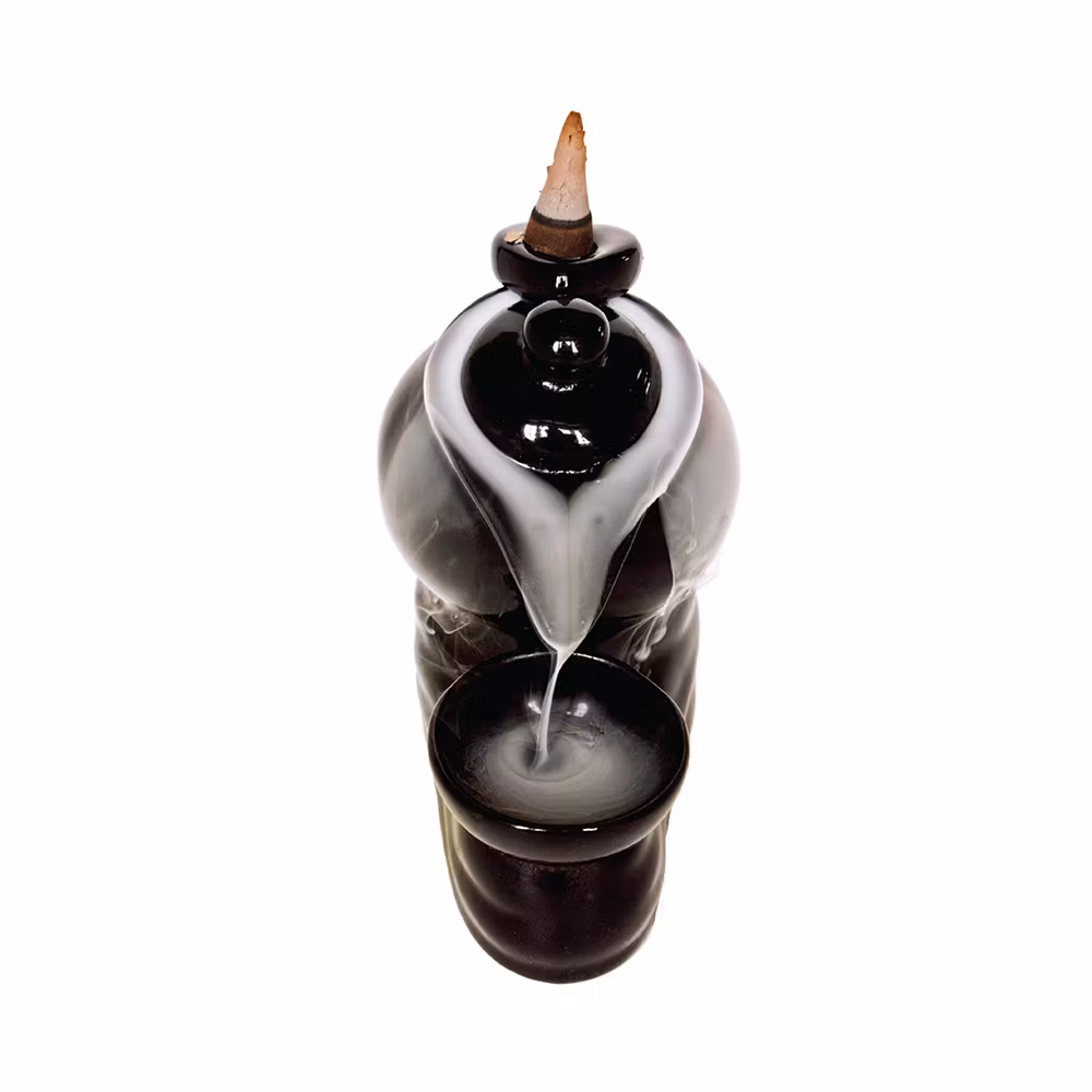 Svart backflow rökelsebrännare är designad att att skapa ett dramatiskt flöde av rök, som rinner nedför tornet och samlas i skålen nedanför (på sätt som framgår av bilden).