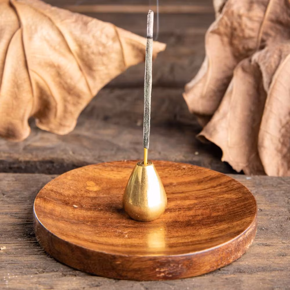 Snygg och stilren rökelsehållare i mässing som står på ett fat av sheeshamträ. Mässingshållaren är flyttbar.