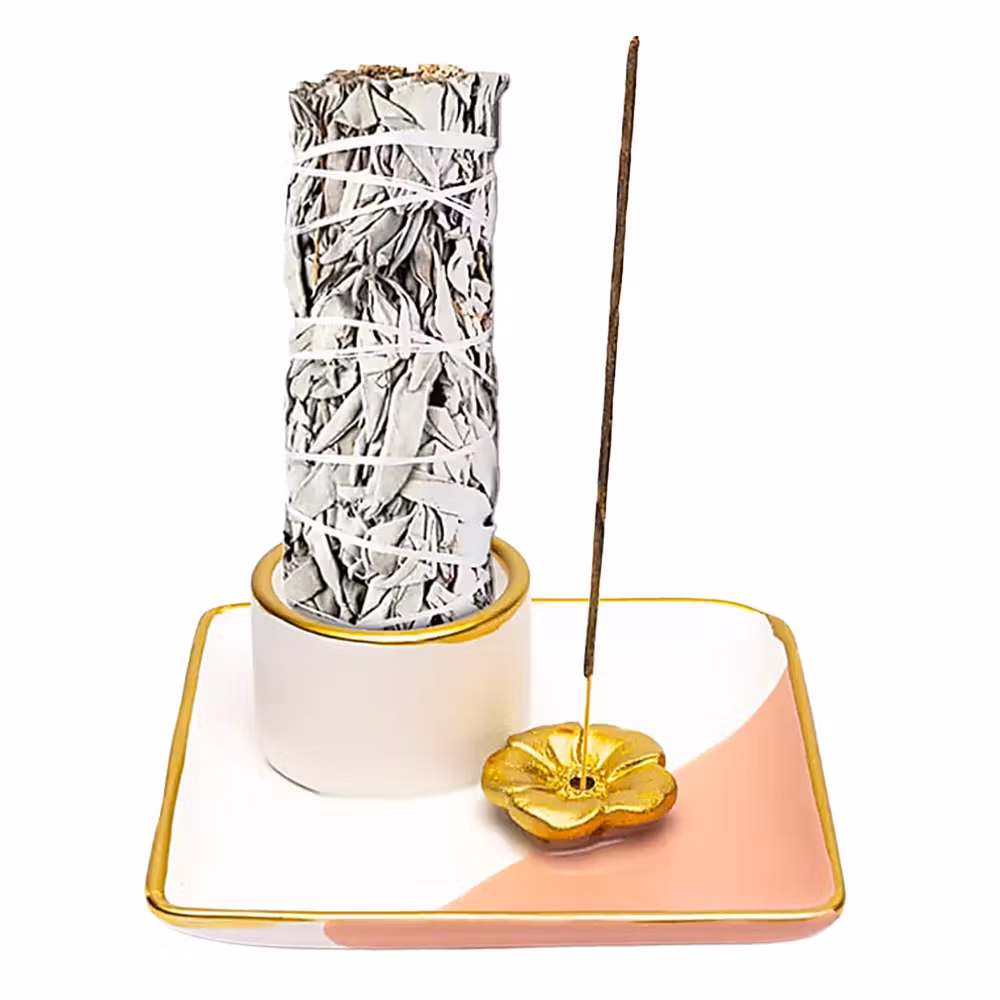 Vacker och dekorativ rökelsehållare till smudge och rökelsepinnar. Rosa, vit och guldig med vacker blomma. Hålet för rökelsepinnarna är lite större vilket gör att den även funkar till japanska rökelser utan bambupinne.