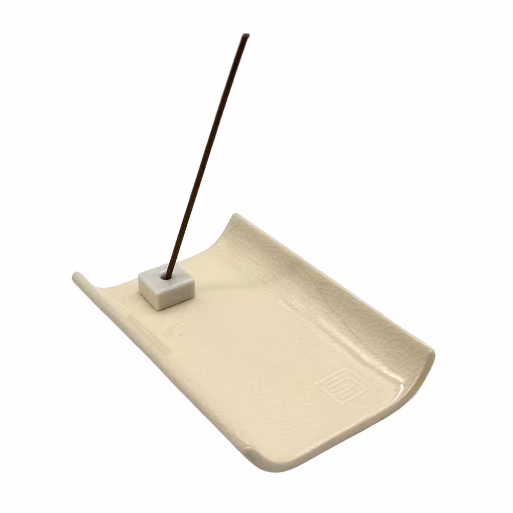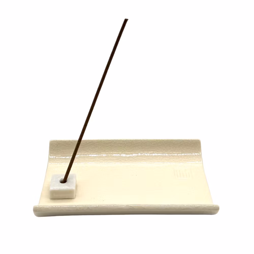 Stilren rökelsehållare i keramik i en benvit färg. Hålet/hållaren för rökelsepinnen är flyttbar. Storleken på hålet avsett för japansk rökelse, ej för rökelsestickor med bambupinne. Rökelsehållaren kan även användas för att placera en rökelsekon.