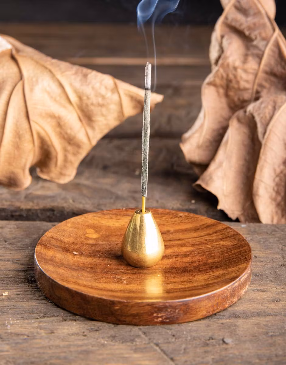 Snygg och stilren rökelsehållare i mässing som står på ett fat av sheeshamträ. Mässingshållaren är flyttbar.