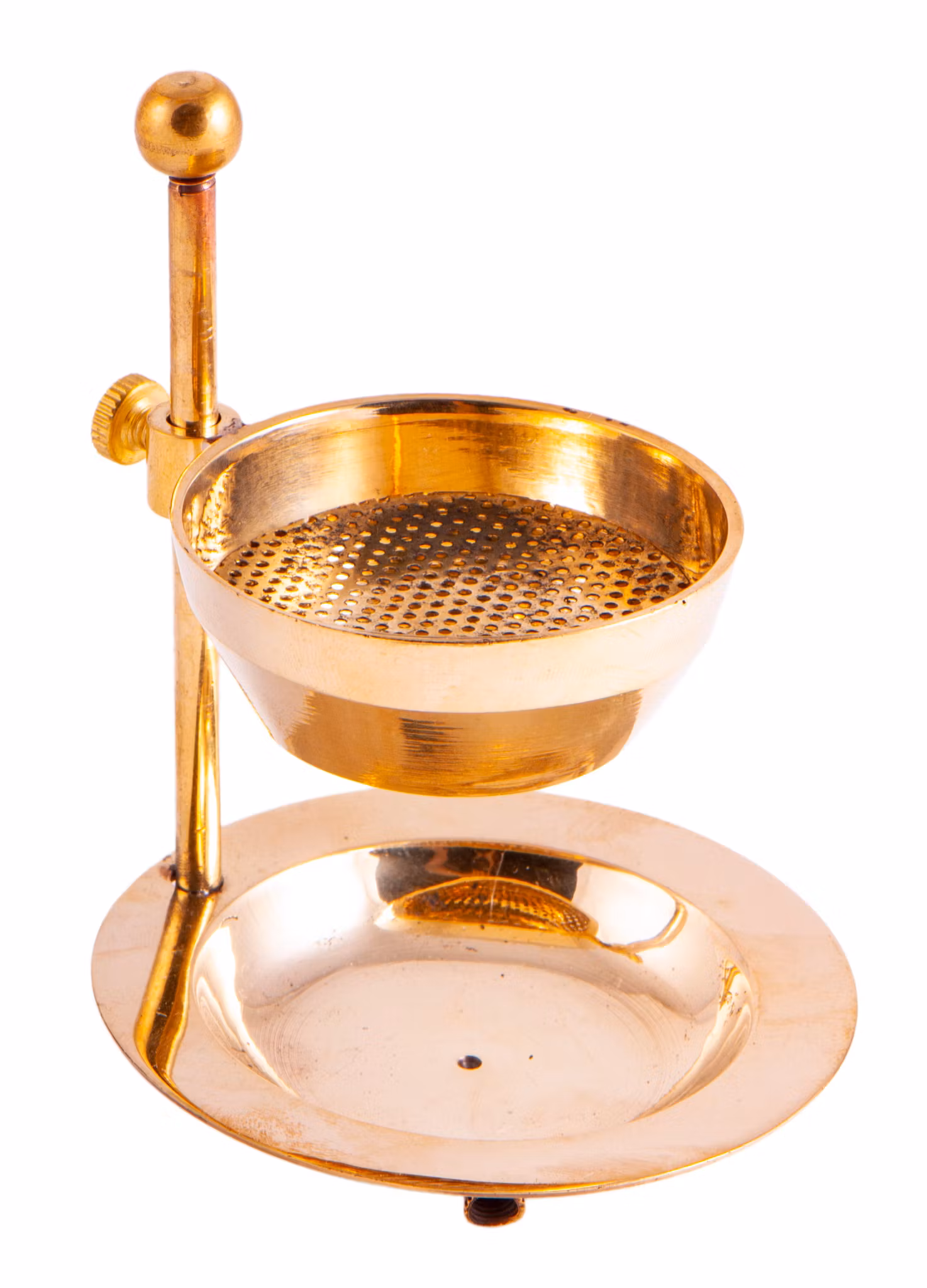 Rökelsehållare i mässing för hartser/resiner och torkade örter. På det övre kärlets perforerade botten läggs korn av resiner eller torkade örter. I den undre delen sätts värmeljus som värmer upp resiner/hartser och örter så att de avger doft. Vissa hartser/resiner eller örter kräver mer värme än andra och därför kan höjden på det övre kärlet regleras för att få lagom värme av ljuset.