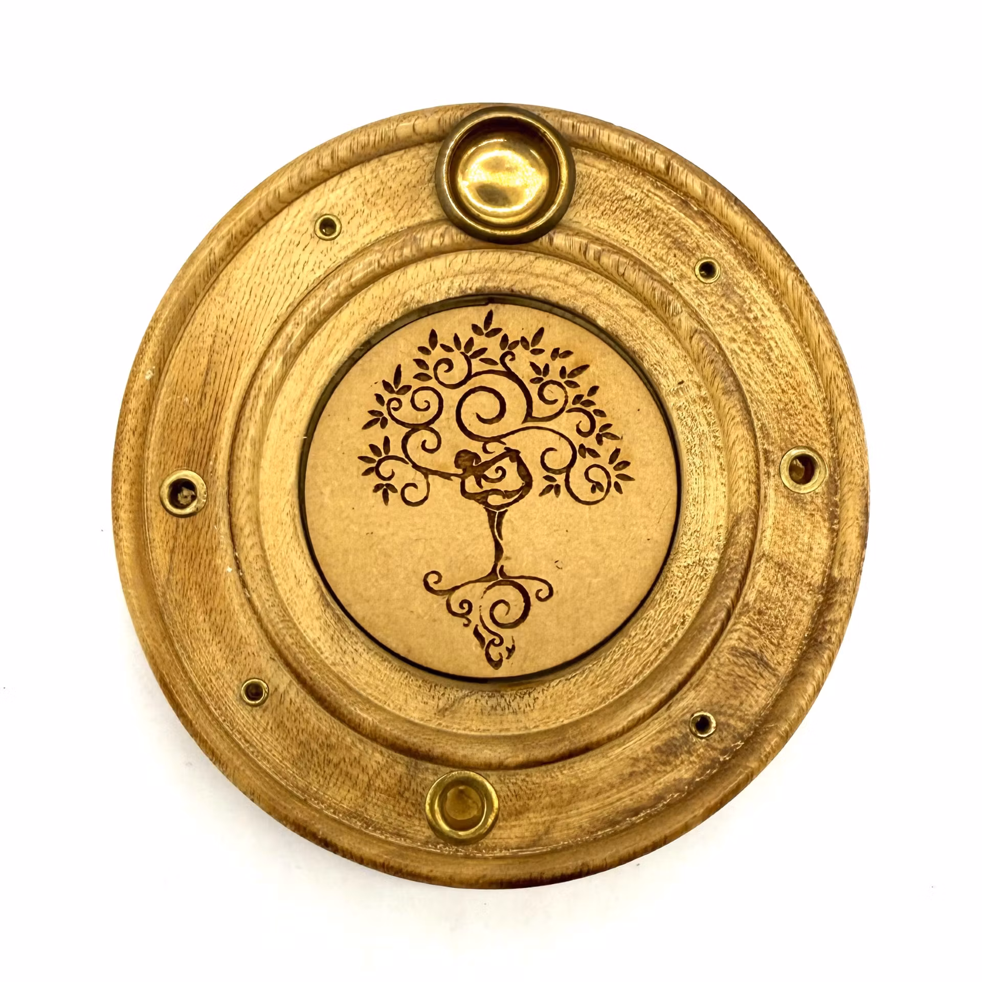 Rund rökelsehållare i trä med ett vacker Yogaträd i dess mitt. Fungerar lika bra för rökelsekoner som för stickor.